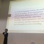 Günün dördüncü sunumunda ise yine konuşma becerilerinin geliştirilmesinde kullanılabilecek etkili sınıf-içi etkinlikleri öğretmen adayları ve hazırlık okulu öğretmenlerinin gözünden inceleyen İngilizce Öğretmenliği bölümü öğrencilerinden Umidbek Suhanberdiyev, rol yapma ve oyunlaştırmanın konuşma becerilerini geliştirmede etkili bir yöntem olduğu sonucuna vardı.
