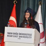 Konuşmanın ardından yabancı öğrenciler adına da dönem mezunu Raşha TARBUSH; Türkçe, Arapça ve İngilizce olarak gerçekleştirdiği konuşmasında kısaca; ikinci vatanım dediği KKTC’de olmaktan çok mutlu olduğunu Üniversiteye, Fakülteye, hocalarına, arkadaşlarına çokşey borçlu olduğunu belirtti. Üniversitede artık bir çalışan olarak yaşlamak istediğini belirtti.