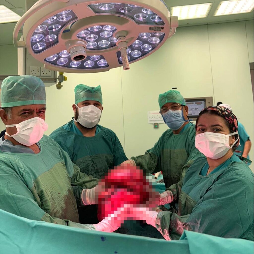 A 71-year-old woman, who had been experiencing abdominal bloating, excessive gas, an inability to defecate, urinary incontinence, and an inability to eat for the past year, lost approximately 10 kilograms during this period. The operation at Near East University Hospital revealed a mass measuring approximately 35×40 centimeters, completely filling the patient’s abdominal cavity. The mass was successfully removed during the operation, performed by Near East University Hospital Chief Physician Prof. Dr. Salih Müjdat Balkan, General Surgeon Assoc. Prof. Dr. Ali Özant, and their team. Following the successful surgery, the patient’s urinary and gas problems recovered on the first day. After starting to eat, she was discharged on the third day in good health.