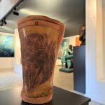 Balık avlayan bir kuşun simgelendiği seramik eser de koleksiyonun çarpıcı eserlerinden. Yalovalı’nın bu eserine ilham veren figür milattan önce 750-600 yıllarına denk gelen 1. Arkaik döneme ait bir vazodan ilham alıyor. Yalovalı’nın seramik üzerinde oluşturduğu kompozisyonda da ağzında bir balık tutan balıkçıl bir kuş figürü yer alıyor. Etrafindada o döneme ait balık motiflerinden esinleniyor.