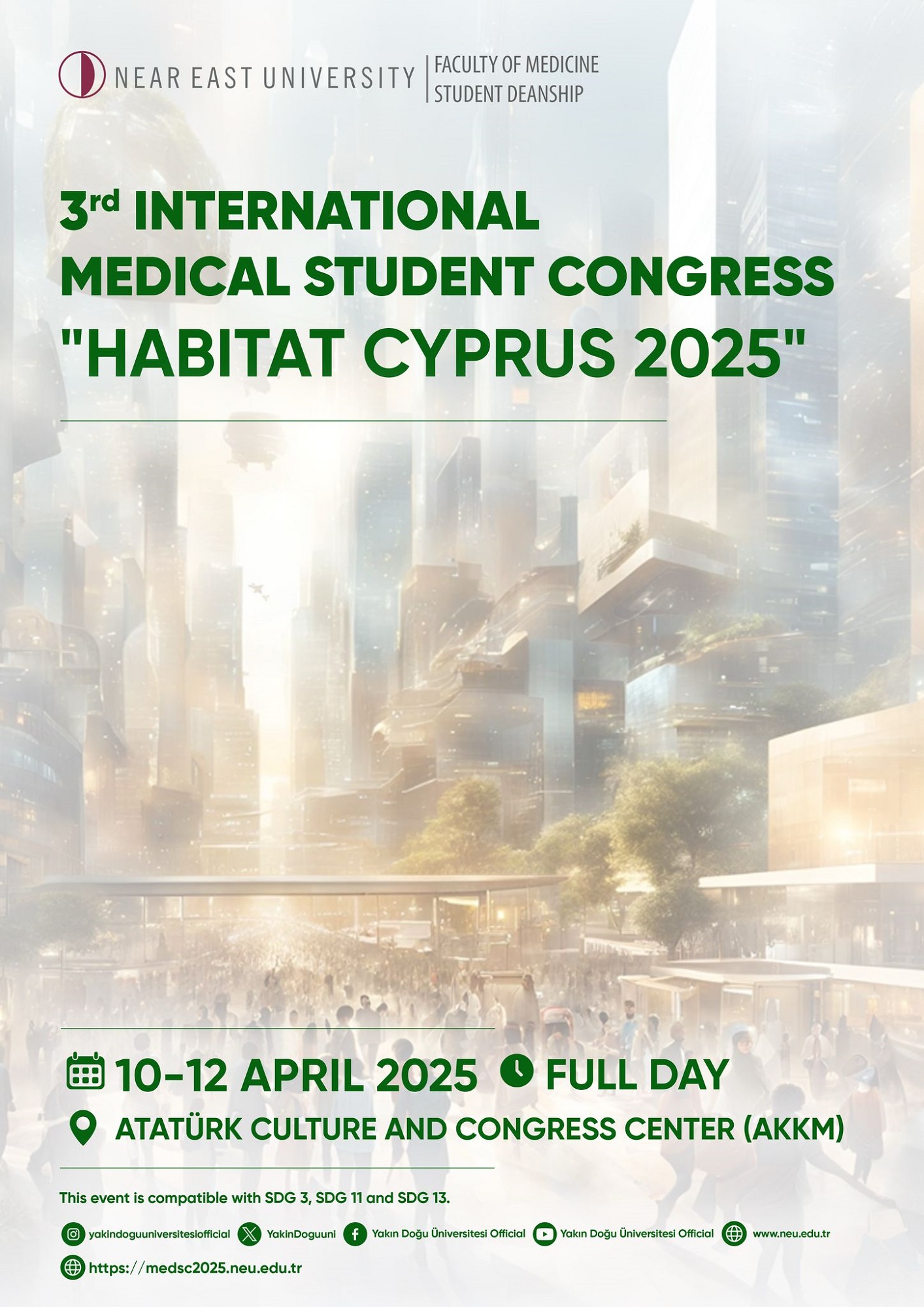 Event Details Day Date Location Reminder 1 10 Nisan 2025 - 08:00 YDÜ Atatürk ve Kültür Kongre Merkezi Link: https://medsc2025.neu.edu.tr/