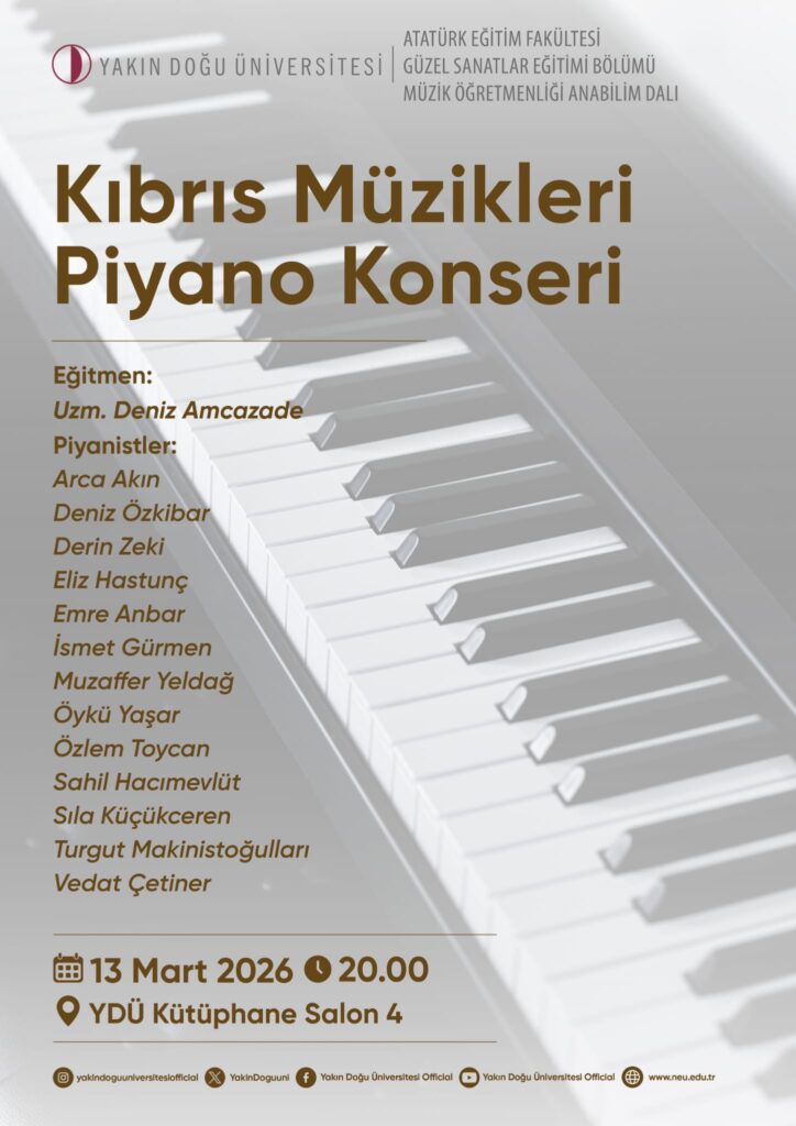 Dünyanın ilk 500 üniversitesi arasında yer alan Yakın Doğu Üniversitesi, kültür ve sanatı yaşamın ritmi ile buluşturmaya devam ediyor. Yakın Doğu Üniversitesi Atatürk Eğitim Fakültesi, Güzel Sanatlar Eğitimi Bölümü Müzik Öğretmenliği Anabilim Dalı tarafından düzenlenen “Kıbrıs Müzikleri Piyano Konseri” 13 Mart  Cuma akşamı saat 20.00’de Yakın Doğu Üniversitesi Kütüphane Salon 4’te gerçekleşecek.