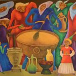 Orazbek Yesenbayev, “Her Zaman Mutluluk Olsun” adlı kişisel sergisinde sergilenen "Hasat" adlı çalışmasında, kırsal yaşamda, kadınların bir araya gelerek olgunlaşmış hasadı toplamalarını anlatıyor.