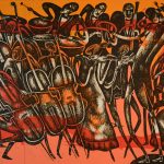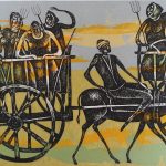Orazbek Yesenbayev, “Her Zaman Mutluluk Olsun” adlı kişisel sergisinde sergilenen "Hasat" adlı çalışmasında, kırsal yaşamda, kadınların bir araya gelerek olgunlaşmış hasadı toplamalarını anlatıyor.