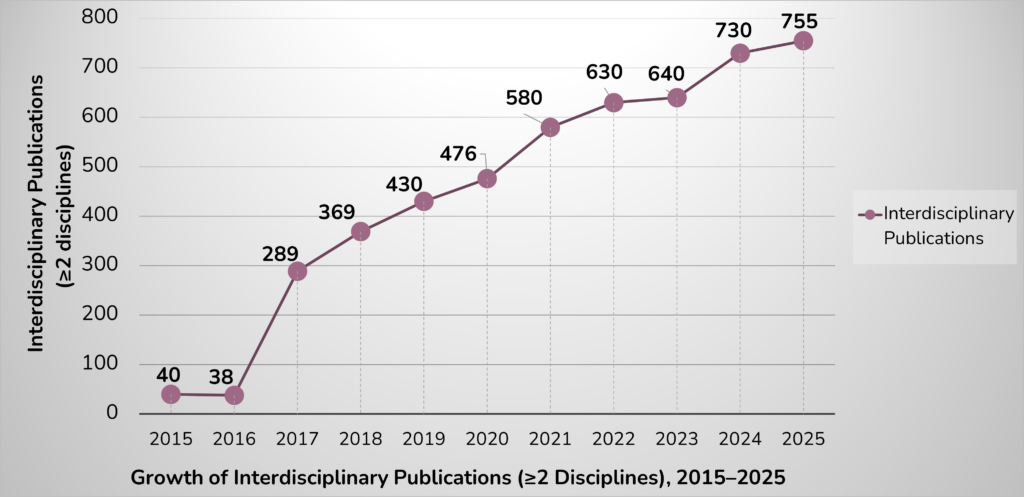 The number of interdisciplinary publications (≥2 disciplines) has increased significantly over the past decade, rising from 40 in 2015 to 755 in 2025. This sustained growth reflects a strategic institutional shift towards collaborative and integrative research practices.