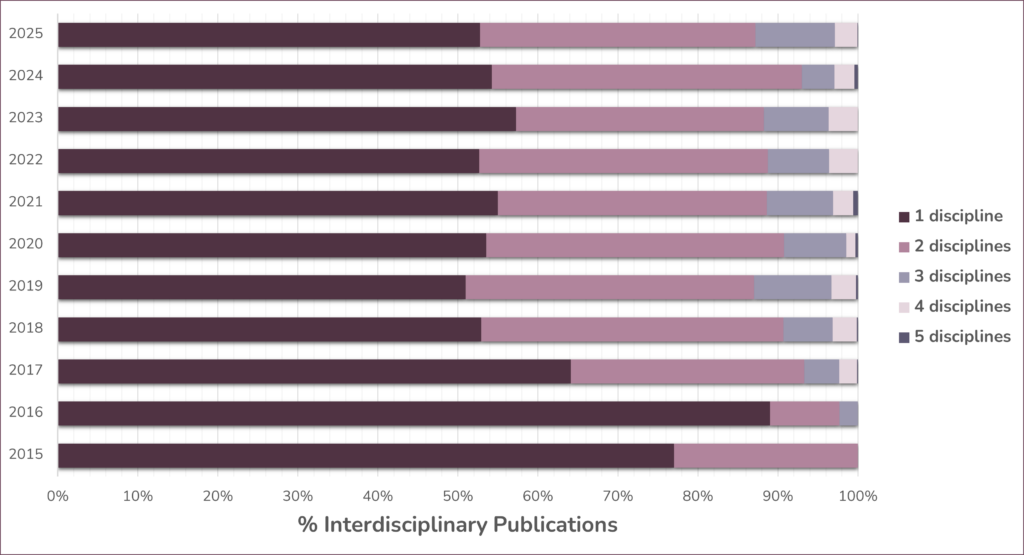 In 2025, 47.25% of all publications involved two or more disciplines, demonstrating that nearly half of all research outputs involve cross-disciplinary integration.