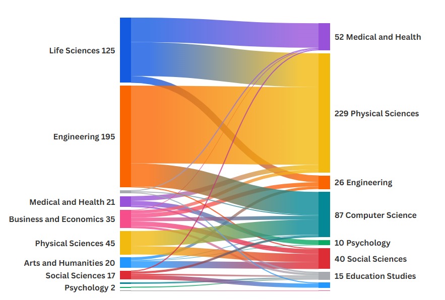 Core scientific areas such as Engineering, Physical Sciences, and Computer Science act as central nodes, connecting with fields including Social Sciences, Medical and Health, and Business and Economics. This networked structure reflects both the depth and maturity of the university’s interdisciplinary research ecosystem.