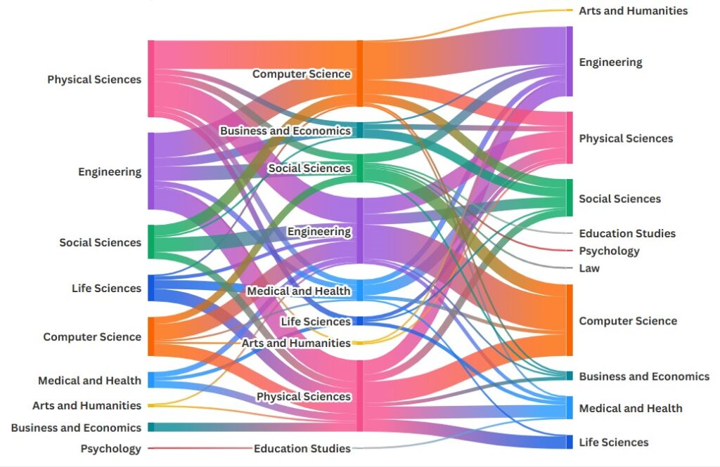 The interaction between disciplines reveals the central role of key scientific domains in interdisciplinary research. Engineering, Physical Sciences, and Life Sciences emerge as major hubs, frequently collaborating with other fields such as Computer Science, Social Sciences, and Medical and Health Sciences.
