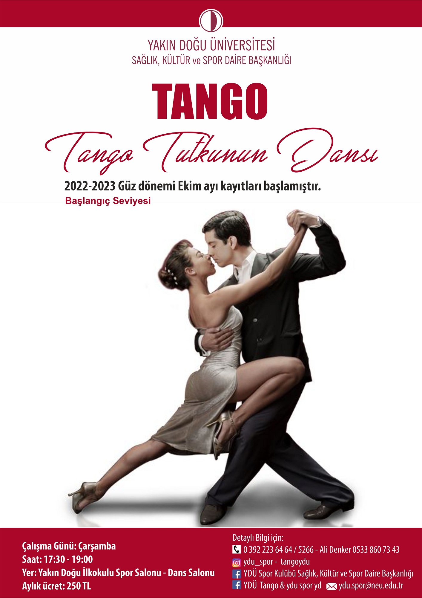 Eklenme Tarihi: 10 Ekim 2022, 15:19 Paylaş: Üniversite bünyesinde 2022-2023 Bahar dönemi tango kurs kayıtları başlamıştır. Partner zorunluluğu yoktur. Seviye: Tamamen BAŞLANGIÇ Seviyesi Tanıtım dersi : 12.10.2022 İletişim: [email protected] / whatsapp: 05338607343