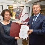 Speaking on behalf of the artists of Kazakhstan, Guldana Zhurkabayev, began her opening remarks by thanking and expressing gratitude to the founding Rector Dr. Suat Günsel on behalf of the Kazakhstan artists and all Kazakh people for every step taken in the development of culture and art of the Turkic world. Zhurkabayev said, "Everyone understands the language of art, because it is a language without borders. The mission of each creator is to leave a piece of his own heart in his work. Today we leave the parts of our hearts with you and this is very proud of us. We are confident that the Cyprus Museum of Modern Arts will have an important place in the art world. Thank you for warmly welcome and for your kind interest."