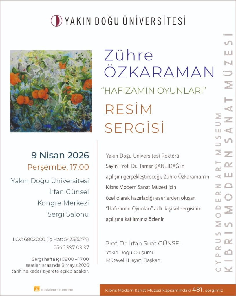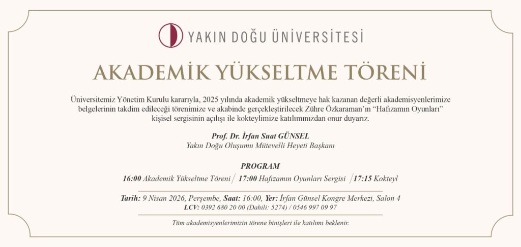 Dünyanın en iyi ilk 500 üniversitesinden biri olan Yakın Doğu Üniversitesi’nde 2025 yılı içerisinde profesörlük, doçentlik ve yardımcı doçentliğe yükseltilen 40 akademisyen belgelerini 9 Nisan’da İrfan Günsel Kongre Merkezi’nde düzenlenen törenle alacak. Törenin akabinde Zühre Özkaraman’ın kişisel sergisi “Hafızamın Oyunları” da sanatseverlerle buluşacak.