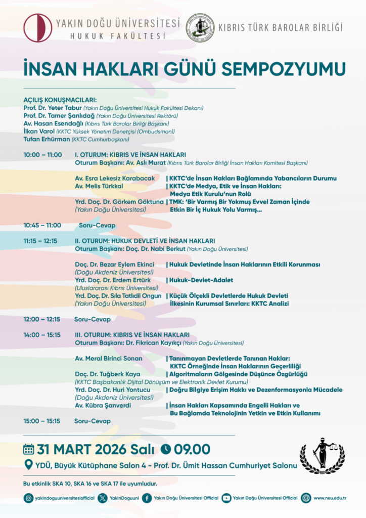 Tüm gün sürecek olan sempozyum Yakın Doğu Üniversitesi Prof. Dr. Ümit Hassan Cumhuriyet Salonu’nda gerçekleştirilecek. Üç ayrı oturumdan oluşacak programda; KKTC’de insan haklarının mevcut durumu, hukuk devleti ilkesi, küçük devletlerde kurumsal sınırlar, medya etiği, dezenformasyonla mücadele, algoritmaların düşünce özgürlüğüne etkisi ve engelli hakları gibi güncel ve kritik başlıklar alanında uzman akademisyenler ve hukukçular tarafından ele alınacak.