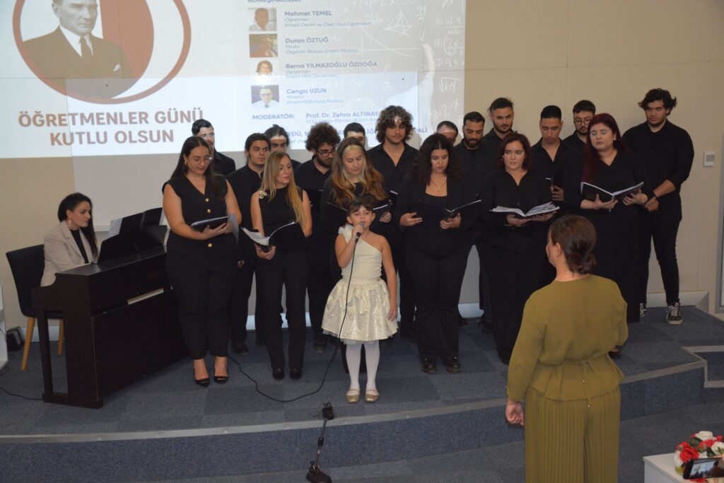 Yakın Doğu Üniversitesi Atatürk Eğitim Fakültesi tarafından düzenlenen “Öğretmenin Gücü: Eğitimde Sürdürülebilir Başarı için Çözüm Yolları” paneli, eğitimde kalıcı başarının nasıl mümkün olabileceğine dair çok yönlü bir tartışma zemini oluşturdu. Yakın Doğu Üniversitesi Atatürk Eğitim Fakültesi tarafından düzenlenen panel, anlamlı bir anla başladı. “En büyük öğretmen Atatürk’tü” vurgusunun damga vurduğu etkinlikte, öğretmenler gününe özel hazırlanan ve ilk kez seslendirilen “Atatürk Eğitim Fakültesi Öğretmen Marşı” büyük beğeni topladı. Söz ve müziği Doç. Dr. Seçil Besim Ayhan’a, düzenlemesi ve piyano eşliği Yrd. Doç. Dr. Hakkı Cengiz Eren’e ait olan marş; Doç. Dr. Emine Kıvanç Öztuğ yönetimindeki Müzik Öğretmenliği Anabilim Dalı Korosu tarafından, Dr. Gözdem İlkay’ın piyano eşliğiyle seslendirildi. Yakın Doğu Üniversitesi’nin öğretmenlik mesleğine verdiği değeri güçlü bir şekilde ortaya koyan bu özel performans, panelin duygusal atmosferini de pekiştirdi. Ardından “Öğretmenim” adlı eser seslendirilirken, küçük solist Özra Öztuğ’un sahneye eşlik ettiği anlar izleyicilerden büyük alkış aldı.