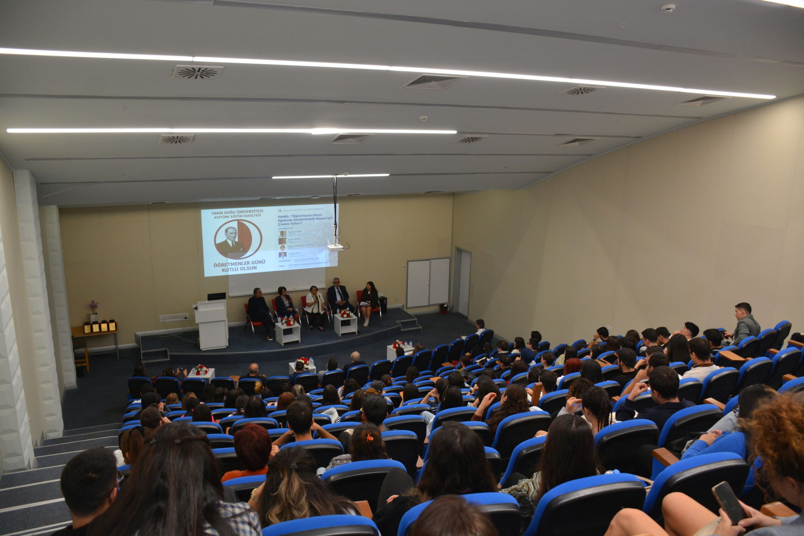 İstiklal Marşı ve saygı duruşu ile başlayan “Öğretmenin Gücü: Eğitimde Sürdürülebilir Başarı için Çözüm Yolları” paneli, Yakın Doğu Üniversitesi Rektör Yardımcısı Prof. Dr. Mustafa Kurt ve Girne Üniversitesi Rektör Yardımcısı Prof. Dr. Gökmen Dağlı, birçok fakültenin dekanı, akademisyenler ve öğrencilerin yoğun katılımıyla gerçekleştirildi. Yakın Doğu Üniversitesi Müzik Öğretmenliği Ana Bilim Dalı Korosu’nun, Şef Doç. Dr. Emine Kıvanç Öztuğ yönetimindeki dinletisiyle başlayan etkinliğin Moderatörlüğünü Atatürk Eğitim Fakültesi Eğitim Bilimleri Bölüm Başkanı Prof. Dr. Zehra Altınay Gazi üstlendi. Panelde, Milli Eğitim Bakanlığı Emekli Daire Müdürü Cengiz Uzun, Emekli Denetmeni Berna Yılmazoğlu Özdoğa, Özgürlük İlkokulu Emekli Müdürü Duran Öztuğ ve Emekli Devlet ve Özel Okul Öğretmeni Mehmet Temel konuşmacı olarak yer aldı. Panelin açılış konuşmasını ise Atatürk Eğitim Fakültesi Dekanı Prof. D. Umut Akçıl gerçekleştirdi.