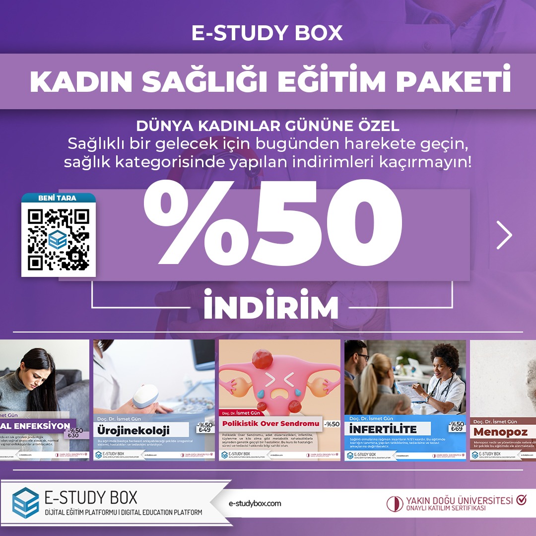 Hazırladığı eğitim programları ile ömür boyu öğrenmeyi hedefleyen Yakın Doğu Üniversitesi’nin dijital eğitim platformu E-Study Box, kadın sağlığı ile ilgili pek çok konuyu bir araya getirdiği özel eğitim paketini 8 Mart Dünya Kadınlar Günü’ne özel yüzde 50 indirimle kadınlara ulaştıracak. Yakın Doğu Üniversitesi Hastanesi Kadın Hastalıkları ve Doğum Anabilim Dalı Başkanı ve tüp bebek uzmanı Doç. Dr. İsmet Gün tarafından verilen eğitimlerde menopoz, ürojinekoloji, vajinal enfeksiyon, polikistik over sendromu ve çiftin istemesine rağmen doğal yollardan çocuk sahibi olamaması olarak tanımlanan infertilite konuları ele alınıyor.