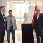 After the speeches, the Minister of Tourism and Environment, Fikri Ataoğlu, presented the Khwarasm Award to Yücel Yazgın, whics is one of the five awards of Alasia Awards decided to be given to master artists by the Cyprus Museum of Modern Arts. Then, he opened the sculpture of Yücel Yazgın designed by the sculptor Nurlan Kebekuulu. Then the exhibition ribbon was cut and the exhibition was opened.